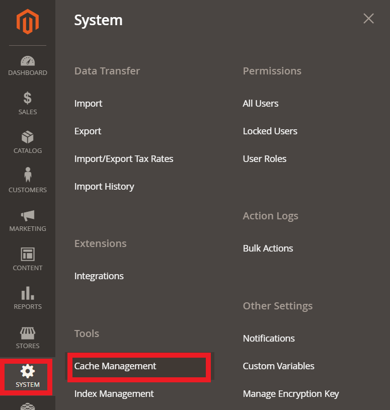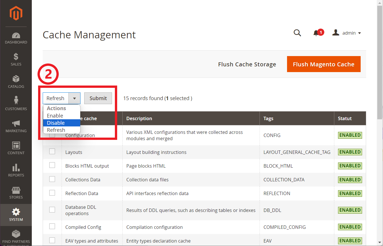 After changing the status for the cache, we advise you to "Flush cache storage" and "Flush Magento cache" pressing the buttons one after the other