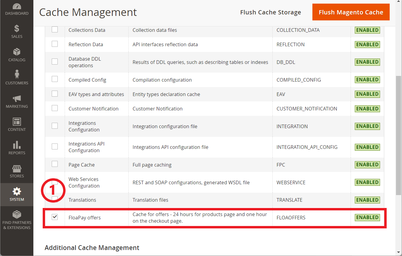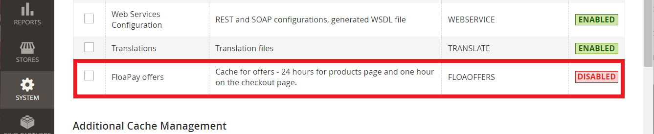 Then, control the cache status for "FloaPay offers". It can be "Enabled" or "Disabled".
