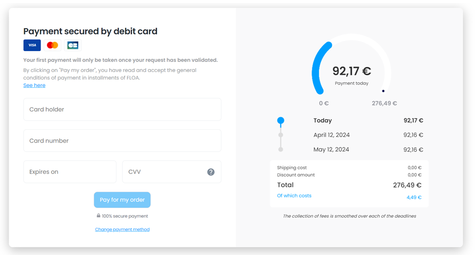 Once your FLOA payment solution are configured and activated, payment method will appear on your shop as follows: