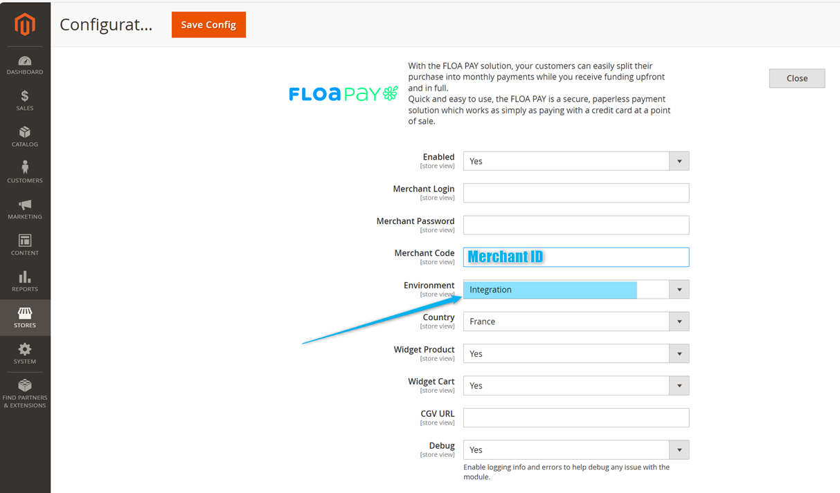 - Fill in the required fields : Merchant Login, Merchant Password, Merchant ID, Environment, Country