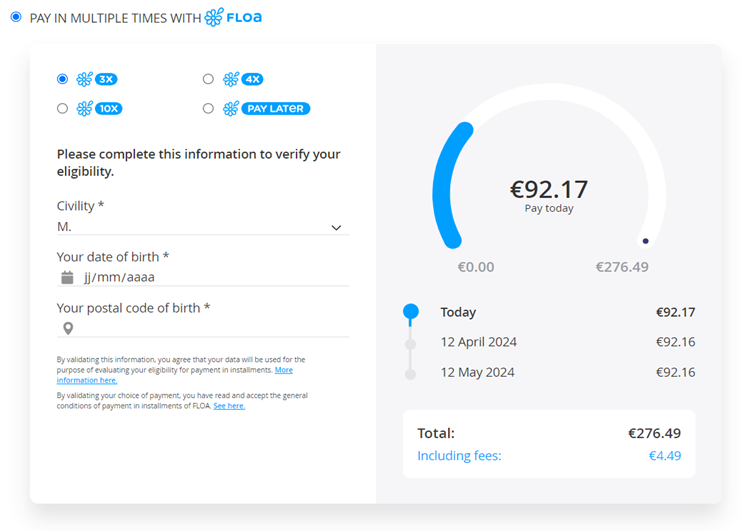 By selecting the available FLOA payment methods, the customer will be asked to fill-in additional information to be eligible for FLOA split payments!